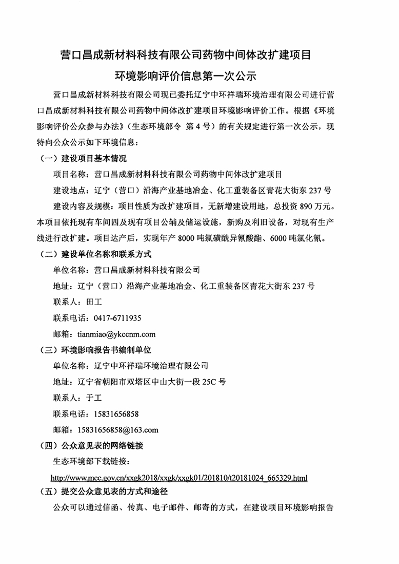 營口昌成新材料科技有限公司藥物中間體改擴(kuò)建項(xiàng)目環(huán)境影響評價(jià)信息第一次公示